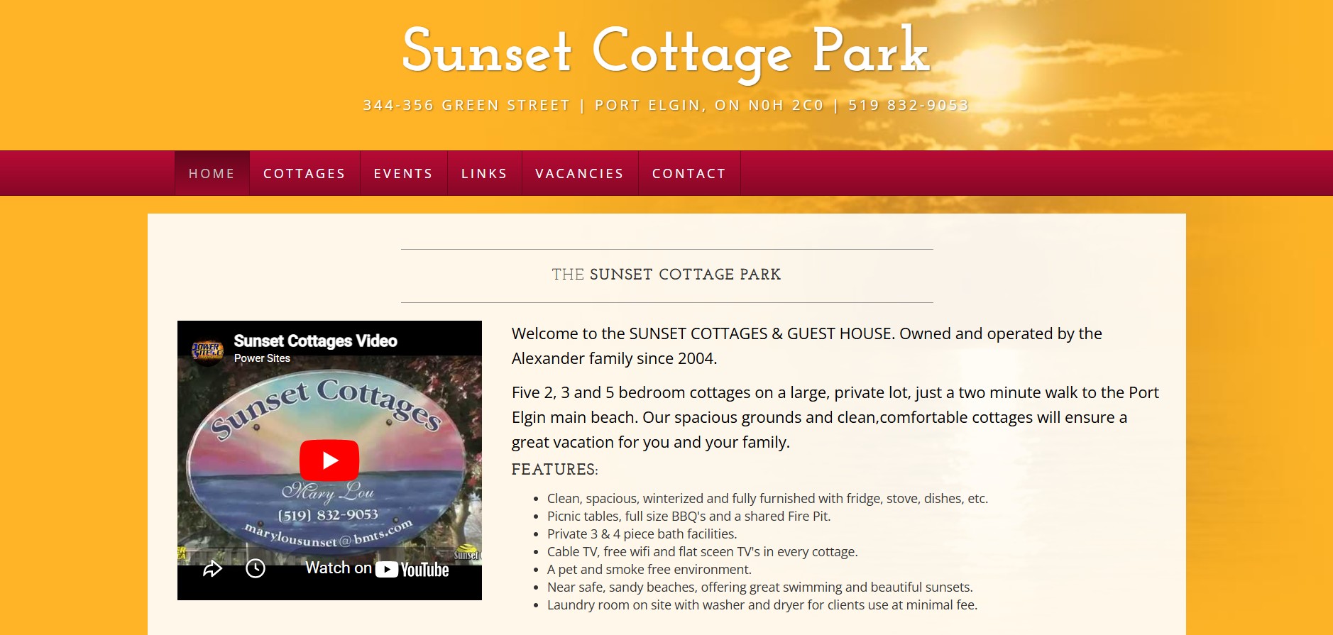 Five 2, 3 and 5 bedroom cottages on a large, private lot, just a two minute walk to the Port Elgin main beach. Our spacious grounds and clean,comfortable cottages will ensure a great vacation for you and your family.